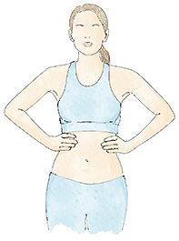 Coloque luego las manos a los lados de las costillas. Inspire por la nariz y expulse el aire por la boca, a la vez que aprieta con las manos haciendo presión hacia abajo