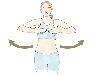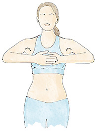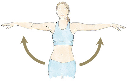 Con los brazos estirados hacia abajo, coja aire por la nariz al tiempo que lleva y recoge los brazos hacia el pecho. Baje de nuevo los brazos y expulse el aire por la boca.