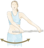 Con la ayuda de un bastón eleve los brazos estirados. Luego balancee suavemente los brazos de un lado a otro tal y como muestra la figura.