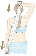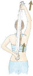 Fíjese en la figura y con la ayuda de una toalla haga como si se secara la espalda tirando de los extremos hacia arriba y hacia abajo. Repita los estiramientos 10 veces inspirando por la nariz y expulsando el aire por la boca.